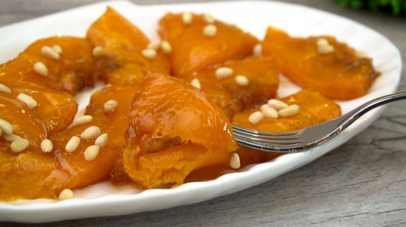 Рецепт запеченной тыквы в карамели. Это невероятно вкусный десерт из тыквы, подается обязательно с орешками. Кстати, так запекают тыкву в Турции, там ее любят подавать с тахинной пастой, обязательное условие - при запекании много сахара.