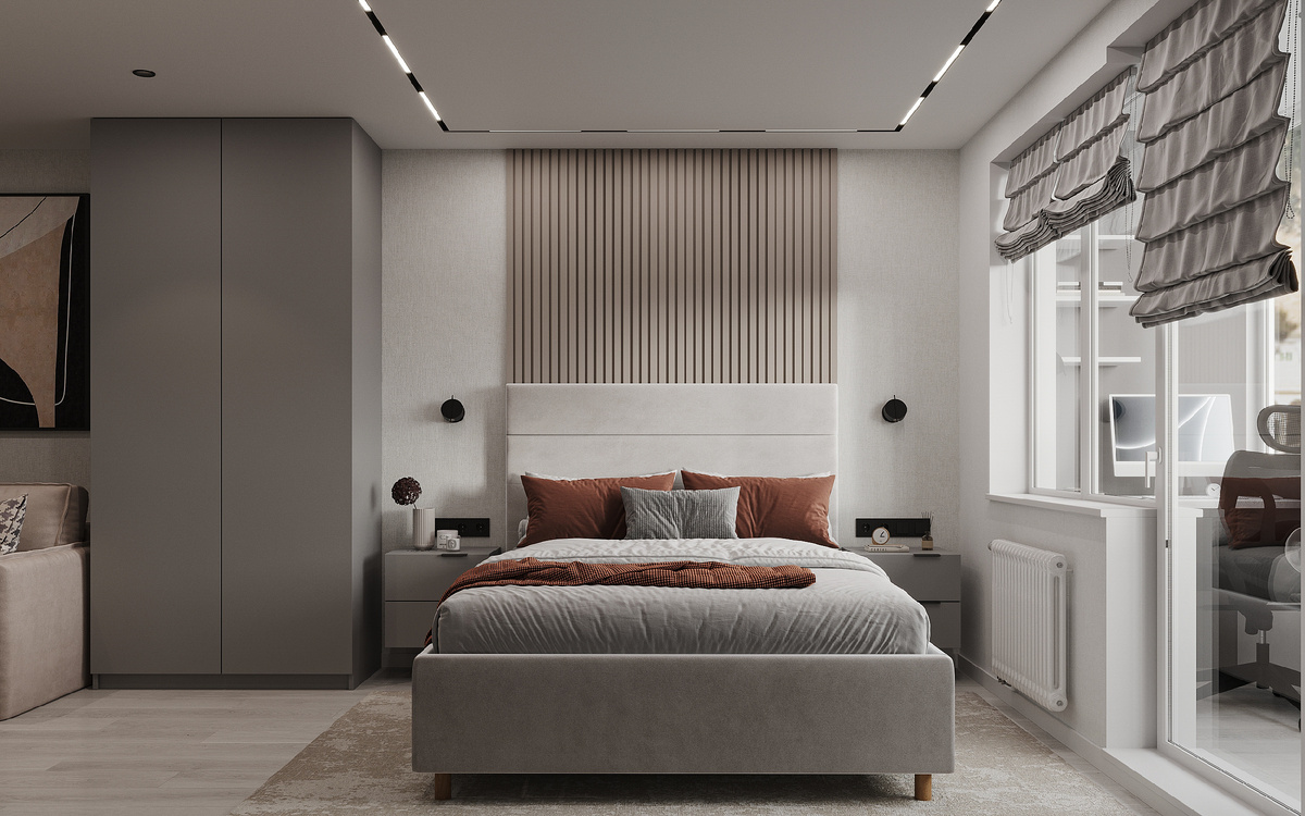 Задачей дизайнера было бюджетного дизайн-проекта комнаты, который можно быстро реализовать и въехать в максимально сжатые сроки. Заказчики - молодая пара студентов. Итак, несколько советов, как недорого превратить пространство в стильное и современное: 1. Цветовая палитра - Используйте нейтральные тона, такие как серый и бежевый, чтобы создать спокойную атмосферу. - Стоимость можно сократить, выбирая краски среднего ценового сегмента. 2. Стены и акценты - Для акцентной стены можно использовать недорогие панели или обои с текстурой. - Можно применить вертикальные панели за кроватью для создания визуальной глубины. 3. Мебель - Кровать с мягкой обивкой можно приобрести в меблировочных магазинах с хорошими скидками или на распродажах. - Прикроватные тумбы можно заменить на бюджетные варианты из IKEA или других доступных брендов. БуБ4. Освещение - Простые и стильные настенные светильники обойдутся недорого. Можно найти аналогичные модели в магазинах с освещением по доступной цене. 5. Текс