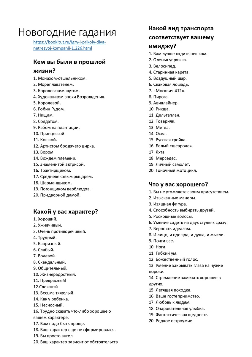 На новогоднем празднике хочется чувствовать себя комфортно. Конкурсы любят не все, а веселиться хочет каждый. Я подобрала конкурсы для активных людей и для тех, кто особо не любит участвовать в развлечениях. Обязательно надо провести конкурсы-предсказания. Они могут быть в разных форматах. Ведущий задает вопрос и просит назвать цифру до 20, затем читает предсказание на названную цифру. Если Вы знаете, что можно пожелать/предсказать родным и близким, заранее подготовьте бумажки с пожеланиями/предсказаниями, которые актуальны для гостей праздника. Участники вытягивают из коробочки карточку с картинкой. Затем он сам, или с помощью других, пытается понять, что предсказывает ему эта картинка. Например, если вытянул карточку с машиной, то - купишь машину. Путем жребия выбираем одного участника. Сегодня он будет президентом. Ему надо будет приготовить новогоднее поздравление. Все остальные пишут на бумажках по 1-2 разных слова и отдают "президенту". Задача "президента" — придумать поздравл