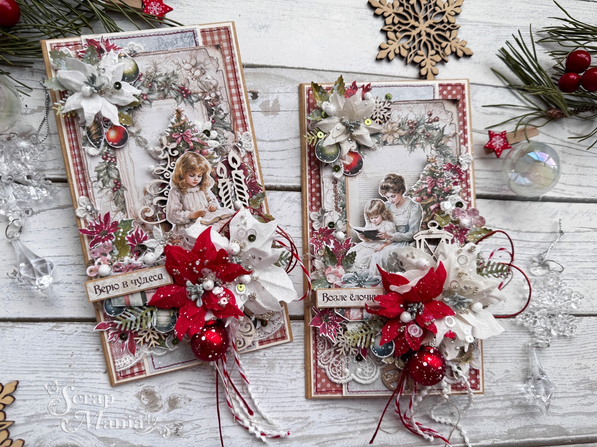 Для создания своих открыток я выбрала коллекцию "Винтажный новый год", которая полностью отражает волшебное и сказочное настроение четвертого этапа. Елочные игрушки, один из ОЭ, представлены в моих открытках в вырезанных элементах, вырубки ножом "Новогодние игрушки" и даже присутствует настоящий стеклянный шарик! Чипборд - это снежинки и шары из набора "Фономикс. Новогодний.