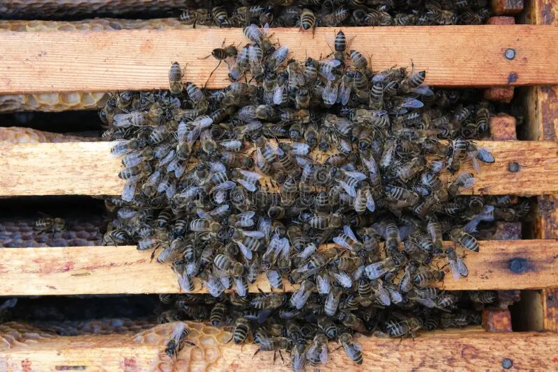 Поскольку величина гнезда весьма существенна для удачной зимовки, перед тем, как окончательно закрыть улей на зимовку, проводят осмотр с целью оценки силы семьи. Срок осмотра — конец сентября. Лучше всего вы брать для осмотра солнечный день после первого заморозка. Для контроля достаточно вынуть две самые дальние от летка прокладки и убедиться, что улочки заняты пчелами. Если леток помещается в нижней или в верхней части стенки, следует вынимать прокладки, расположенные ближе к противоположной стенке, если леток расположен посреди передней стенки, то следует вынуть по одной крайней боковой прокладке гнезда. Пчелы должны занимать все улочки, кроме расположенных за разделительной доской. Если и в этом пространстве находится большая группа пчел, гнездо расширяют одной рамкой сотов с запечатанными медом (сахаром). Обычно они всегда бывают под рукой — их вынимают во время осмотра из слишком больших гнезд. Осмотр особенно важен в ульях-лежаках и в ульях с большими рамками. В стояках с кормовой над ставкой (из двух корпусов) осмотр невозможно провести по техническим причинам. Однако здесь величина гнезда не столь критична для удачной зимовки, поскольку вертикальная конструкция улья облегчает пчелам поддержание нужного микроклимата в самом клубе и над ним. При зимовке пасеки в омшанике гнезда делают объемнее, в среднем на 2 рамки на улей.