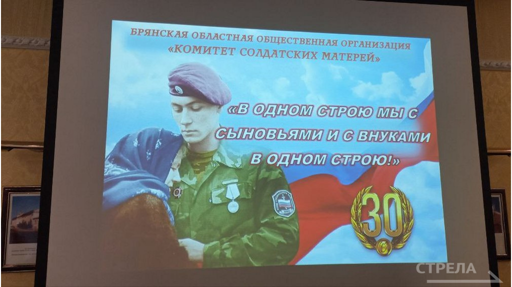 Сегодня, 6 декабря, в Брянске прошло торжественное мероприятие в честь 30-летия регионального Комитета солдатских матерей «В одном строю мы с сыновьями и с внуками в одном строю». В мероприятии принимали участие почетные лица: врио замгубернатора Брянской области Виталий Свинцов, председатель регионального Комитета солдатских матерей Алла Власова, врио заместителя командира бригады по военно-политической работе майор Сергей Сахоненко, начальник штаба войсковой части 86 589 майор Андрей Кузнецов, представители Комитета и другие. Виталий Свинцов зачитал благодарственное письмо от губернатора Александра Богомаза. - Уважаемая Алла Васильевна, дорогие женщины, мамы. Поздравляю Брянскую областную общественную организацию Комитет солдатских матерей с 30-летием. Комитет солдатских матерей – одна из самых деятельных общественных организаций нашей великой Родины. В организации состоят мамы ветеранов и инвалидов боевых действий, а также те, чьи родные погибли при исполнении воинского долга. И все