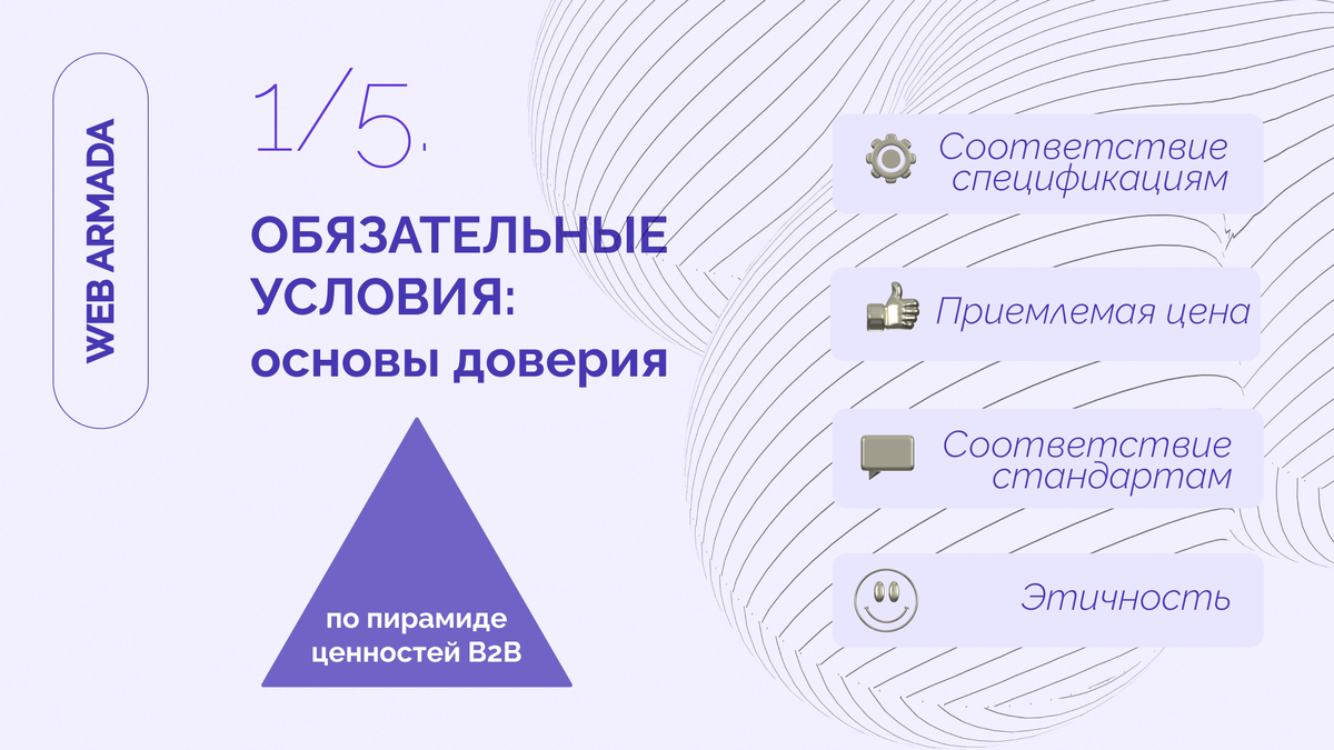 В B2B-секторе бизнес-отношения строятся на доверии и уверенности в том, что продукт или услуга выполнят свои базовые функции. На самом низком уровне пирамиды ценностей находятся обязательные условия, которые выступают минимальными требованиями для выхода на рынок и являются фундаментом любого делового взаимодействия.