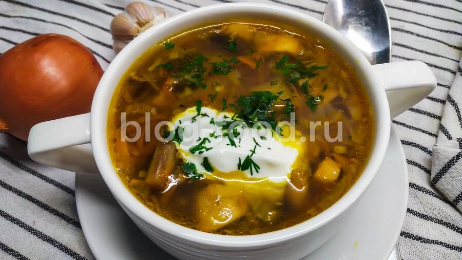 Всем привет. Сегодня сварим простой грибной супец, а вернее щи. Капуста, морковка, лук, совсем чуть-чуть мяса и очень вкусные щи готовы. Продуктовый набор: Грибы режем ломтиками, картошку и ветчину кубиком, лук помельче, морковь натираем на крупной тёрке, капусту шинкуем. Кипятим пару литров воды, разводим бульонные кубики, кладём капусту, картошку, лавровый лист, доводим до кипения, варим полчаса на минимальном огне. Обжариваем на сильном огне шампиньоны в течение трёх минут, перекладываем в миску. В сковороду выкладываем лук, давим чеснок, добавляем немного масла, жарим три минуты. Добавляем морковь, жарим пару минут, кладём ветчину, готовим три минуты, помешивая. Выкладываем грибы, прогреваем пару минут... ...добавляем в кастрюлю, солим, перчим по вкусу, довариваем всё вместе, оставшееся до получаса время (порядка 15 минут). Подаём со сметаной и зеленью. Приятного аппетита!