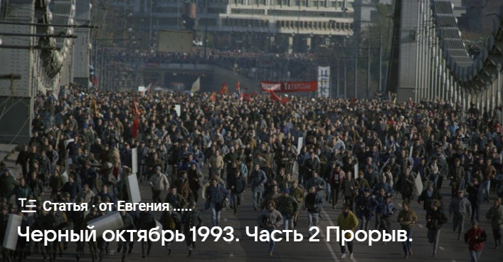 “Когда я туда подошел, то увидел, как голова огромной колонны медленно движется по Крымскому валу, а на Крымском мосту стоит “черепаха”, а чуть сзади нее быстро выстраивается вторая. ... Я уже был метрах в 50-60 от головы колонны, когда услышал грохот щитов, крики. И тут я – человек трусливый и осторожный – ломанулся вместе со всеми вперед. Дальше все было довольно сумбурно. ... Помню как стреляли милиционеры по людям на мосту, как плыли по реке каски, как оттеснили ментов, как вели с моста разбежавшихся, бледных как смерть ОМОНовцев. ... Через несколько секунд, может, чуть больше, с полминуты, я с середины моста увидел голову колонны, она была уже за путепроводом, где-то у станции “Парк культуры. Люди бежали довольно плотно, по дороге снимая спецсредства с задержавшихся ОМОНовцев или милиционеров из второй “черепахи”: щиты, бронежилеты, дубинки. Люди, почти безропотно претерпевшие многодневные избиения, на бегу вооружались. У Зубовского голова колонны столкнулась нос к носу со взводом спецназа. Подъехали три “Паза” и “УАЗ”, из них высыпали около 70 спецов, в серо-пятнистом камуфляже, с дубинками и щитами, в шлемах с забралами. Они построились в “черепаху”, но их мало, они не могут перекрыть даже половину Садового и строятся напротив ямы (там ремонтируют какие-то подземные коммуникации), чтобы хоть как-то прикрыть фланг. Это не помогло: голова колонны превратилась в клещи. С ними даже не стали драться. ОМОНовцы бегут наперегонки со своими автобусами. В них и в автобусы летят камни. ... Бежим. Садовое кольцо от Зубовского почти до самого МИДа разделено бетонными блоками. Посередине кое-где стоят грузовики, фронтальные погрузчики – здесь идут какие-то ремонтно-строительные работы. Люди кидаются почему-то к грузовикам, не обращая внимания на погрузчики. Дверцы взламываются, одни машины заводят ключами, другие – без ключей. Тот самый “КАМАЗ” с будкой, которым потом были протаранены “черепахи” на Смоленской, захватывали у меня на глазах... Я не стал ждать... и побежал вперед. Только через некоторое время “КАМАЗ” нас обогнал, почти возле самого МИДа. Здесь нас уже пытались остановить всерьез, но ситуация развивалась стремительно. Очень мощный, но тоже сборный заслон милиции,ОМОНа мы застали в момент построения и развертывания. “Черепахи” уже почти построились, за ними стояли два водомета, и подходили еще машины с людьми. Нас стали обстреливать из гладкоствольных ружей резиновыми пулями и газовыми гранатами, заработали водометы, но мы не дали им времени. Колонна подалась назад. В милицию полетели камни, а посреди площади разворачивался “КАМАЗ”. Быстро развернувшись хвостом вперед, он начал сдавать задом максимально быстро, как мог, на “черепаху”. “Черепаха” рассыпалась, строй смешался, и люди все разом рванулись вперед, а “КАМАЗ” уже таранил водомет. В панике ОМОНовцы бросили оба водомета, а демонстранты обложили обе машины впритык, прутьями выбили стекла, засыпали кабины мелкими камнями. Водомет, сигналя, развернулся и помчался прочь, а колонна захватывала подходившие ментовские машины. Большинство машин было брошено водителями сразу же, как только их окружили люди. Машины бросались вместе со всем, что там находилось, включая, естественно, и ключи от машин”,