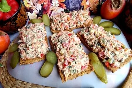 Ингредиенты галеты с семечками - 4 шт. маринованные огурцы скумбрия горячего копчения - 0,25 шт. паприка - 0,5 шт. морковь тёртая - 0,5 шт. майонез - 2 ст.л. сыр тёртый - 2-3 ст.л. приправа для салатов зелень петрушки соль 1. Натереть сырую морковь,нарезать мелко паприку. 2. Огурцы измельчить или натереть. 3. Смешать овощи. 4. Скумбрию очистить от костей. 5. Распотрошить и отправить к овощам. 6. Добавить майонез,сыр,зелень,приправы. 7. Перемешать массу. 8. Можно подать на гренках. 9. Нанести намазку на хлебцы. 10. Подать к завтраку или на перекус. Еще больше рецептов ищите в наших социальных сетях: Телеграм, Вконтакте, Одноклассники!