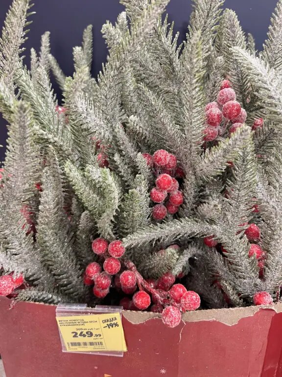 Всем привет! В Магните вновь появился новогодний товар и я спешу поделиться тем, что же там привезли. Заснеженные новогодние ветви елки с красными бусинами. Цену писать не буду, она есть возле каждого товара. Вот так эти ветки выглядят. Еще вот такие ветки с имитацией белого яблока. Блестки сильно сыпятся, поэтому, если их покупать, то нужно сбрызнуть лаком для волос перед эксплуатацией. Появились вот такие новые елочные игрушки. Цены также есть под каждым набором. Мини-елки на подставке. Честно, мне они вообще не понравились. Свечи в виде новогодних елочек и украшение избольшой шишки. Сразу возле касс появился такой стеллаж с новогодней атрибутикой. Целый стеллаж с домашним текстилем и не только. Декоративная посуда в форме елок. Но цены на нее слегка завышены. Такое обновление было на этой неделе в Магните. До скорых встреч!