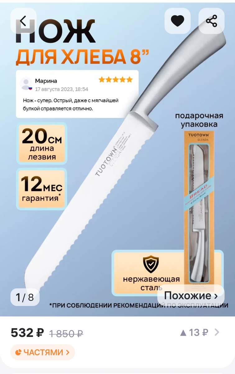Не про котиков... Меня всегда удивляли рекомендации на WB и Озон – если я что-то купила, то меня в рекомендациях обязательно закидают чем-то подробным. Спрашивается – зачем? Ведь я уже это купила!!! Недавно приобрела нож... Для хлеба. У меня был подобный, покупала в обычном магазине лет 30 назад и тогда он позиционировался как нож для замороженного мяса. Теперь же это – нож для хлеба!))) Мой нож все эти годы был острым, как сатира Задорнова и ни разу не точился. Если честно, я даже не знаю как точить подобные ножи. Но это ему и не было нужно. Он мог и через 30 лет лет моментально разрезать все, что угодно. Вот только деревянная ручка не выдержала и треснула. Поэтому, я остановила выбор почти на вечном – лезвие и ручка единое целое. Пока рекомендовать не могу, этот нож у меня меньше недели, но сейчас мне все нравится – тяжеленький, режет все, что угодно! Надеюсь, он тоже до конца своих дней останется таким же острым. И вот, только я его приобрела, как меня тут же закидали подобными ножа