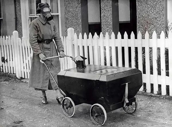 Женщина тестирует коляску, устойчивую к газовым атакам, в Хекстебле, Англия, в 1938 году, незадолго до начала Второй мировой войны.