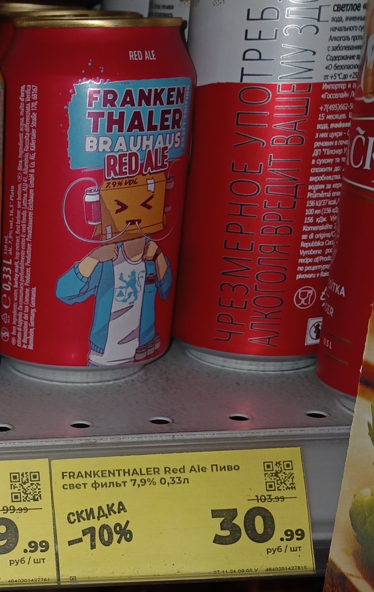 Здравствуйте, дорогие друзья. Магнит прямо таки зачастил с распродажами. Крепкие напитки и вино уже были в наших обзорах, теперь настало время пива. Московская область Frankenthaler Red Ale - красный эль, изготовленный в Германии. Что-то относительно новенькое, ранее не встречалось. Крепость 7,9%. 30 рублей за 0,33л с учётом скидки 70%. Яркое и запоминающееся оформление, что внутри, пока не ясно. За такую цену взял на пробу. В Магнитах присутствуют ещё две разновидности Frankenthaler Brauhaus - это Session IPA и просто IPA. Они уже на 1 рубль дешевле. Скидка та же - 70%, ёмкость 0,33л. Такой вот бурый медведь продаётся по 26 рублей. Theodore Brown Keller Beer. Немного в сторонке стоят ещё два медведя - белый полярный медведь(пшеничное)и медведь губач(лагер). Смотря на витрину, невольно вспоминается русская народная сказка Три Медведя) Ну и наконец - безалкогольное российское пиво Ein Bier по 18 рублей за 0,45 литра. По некоторой информации, алюминиевые банки объёмом 0,5 литра перес