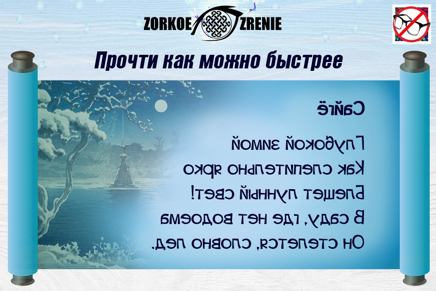 Прочти написанное наоборот японское пятистишие! Если при этом сознательно активизировать логическое ядро, например, постараться запомнить небольшой рифмованный текст, то нейронные «зрительные сети» взаимодействуют с другими участками мозга, восстанавливая и поддерживая всю зрительную систему целиком. Зрительные зоны мозга активизируются, и это способствует быстрейшему восстановлению зрения! Ответьте, как у вас получилось: Я был(ла) в затруднении! Я прочёл(ла) свободно! Я прочёл(ла) и могу рассказать суть прочитанного! Я прочёл(ла) и запомнил(ла) стих!