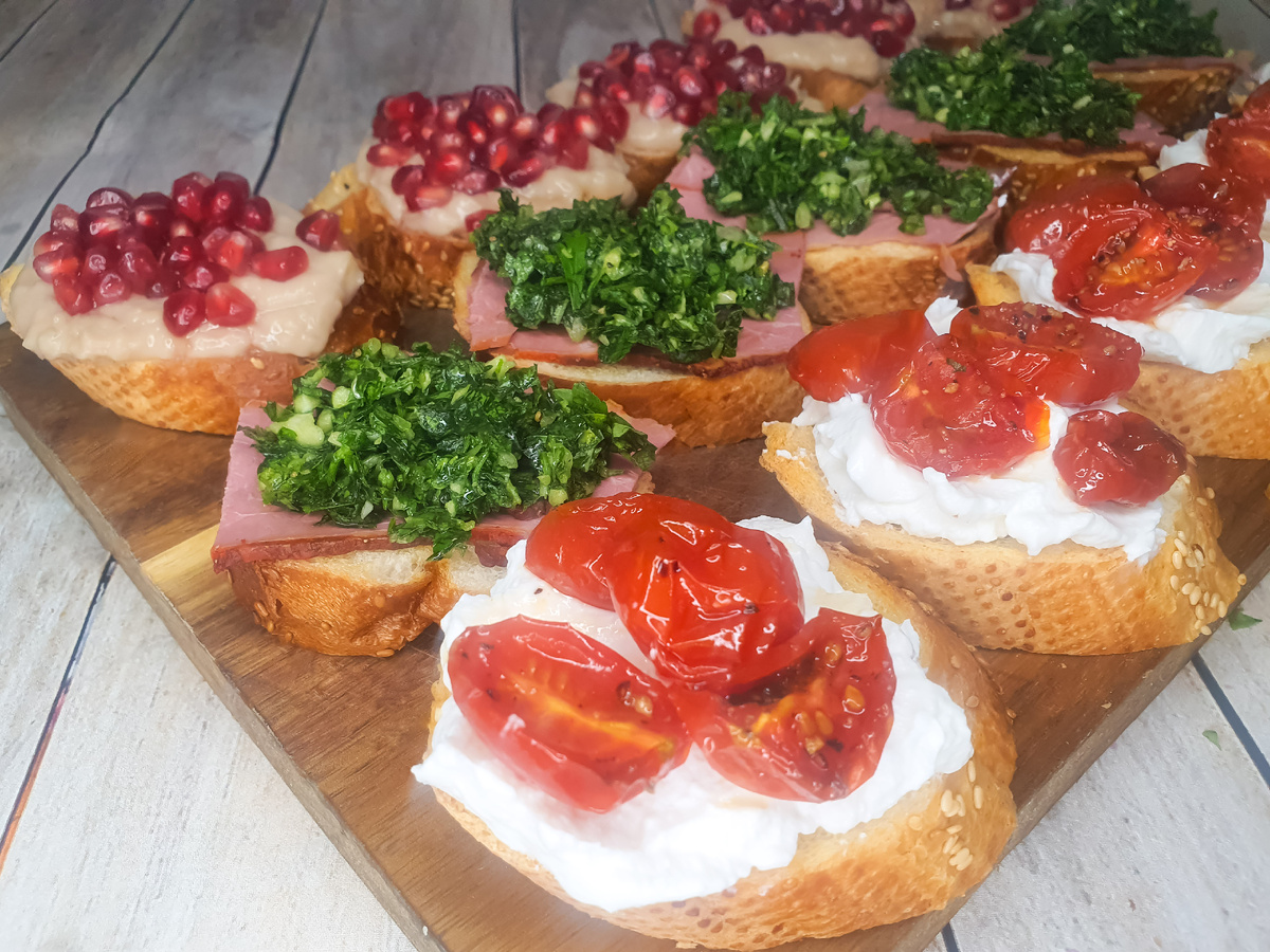 Эти простые, вкусные и элегантные закуски подойдут практически к любому праздничному столу. Такие маленькие бутербродики можно подать к праздничному ужину или поставить на фуршетный стол. Конечно, вряд ли такие кростини станут "главными героями" вашего стола, зато они точно сделают его наряднее, добавят разнообразия и вкуса. Кростини не нужно слишком перегружать, гораздо интереснее будет приготовить несколько видов таких небольших закусочных бутербродов. Багет для кростини нужно нарезать не слишком толстыми ломтиками слегка по диагонали, сбрызнуть оливковым маслом и поджарить на сковородке или отправить на 10 минут в духовку, разогретую до 180-ти градусов. Сыр и помидоры – это всегда беспроигрышное классическое сочетание, у которого есть огромное количество вариантов. Для этой закуски томаты нужно будет предварительно запечь и остудить, поэтому лучше не готовить её в последний момент. Рикотту смешиваем с одной ложкой оливкового масла и чесночным порошком. Помидоры черри режем пополам