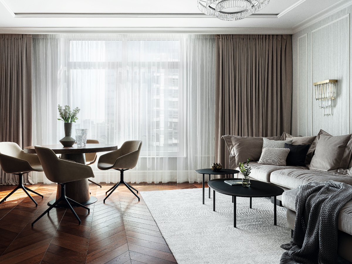 Квартира в жилом комплексе «Леонтьевский мыс» на Петроградской стороне. Месторасположение в окружении водных артерий задает прекрасный вид из окна. Это стало исходной точкой при создании концепции интерьера. Простая лаконичная планировка, изысканная отделка, сдержанность, элегантность — вот что отличает квартиру настоящей леди. Вдохновляясь личными качествами прекрасной владелицы, удалось создать гармоничный интерьер, который надолго сохранит свою актуальность. Приятную атмосферу формирует логичное, продуманное пространство, мягкий свет, тщательно подобранные материалы, комфортная мебель. Пожалуй, самое главное в этой квартире то, что в ней хорошо и удобно жить. При работе с планировкой были учтены три основных пожелания: создание максимально просторного интерьера, наличие двух гардеробных и обеденный стол у окна с живописным видом на одну из водных артерий Петербурга. Объединение кухни, столовой и гостиной стало хорошим решением. Выбранные материалы создают тактильный комфорт, поддерж