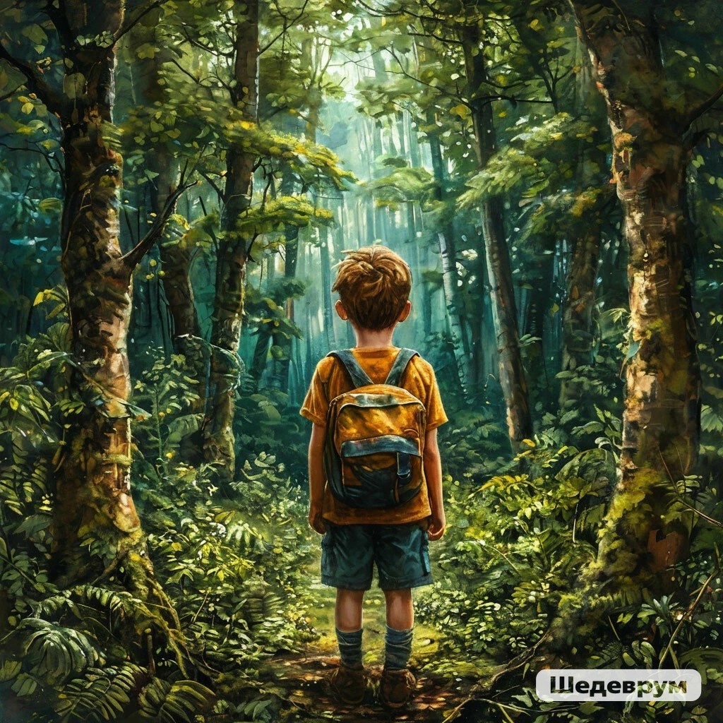 Ранним осенним утром, когда роса ещё сверкала на траве, а солнце только начинало пробиваться сквозь густые кроны деревьев, Мишка отправился в путь. Сегодня был знаменательный день – его первый учебный день. Школа находилась в соседней деревне, за лесом, и Мишка с волнением ждал этого дня уже много недель. Он попрощался с родителями, крепко обнял свою бабушку и, взяв с собой бутерброд с маслом и вареньем, отправился в путь. Лес казался таинственным и волшебным в утреннем тумане. Птицы пели свои приветственные песни, а ветер шептал истории о дремучих чащах и лесных обитателях. Мишка шёл уверенно, следуя по тропинке, которую ему показала бабушка. Но чем дальше он заходил в лес, тем гуще становилась растительность, тем меньше света проникало сквозь листву. Тропинка стала нечёткие, а птицы запели тревожные трели. Внезапно Мишка понял, что заблудился. Он оборачивался, пытаясь вспомнить дорогу, но всё вокруг казалось незнакомым. Страх сжал сердце мальчика. Он крикнул, надеясь услышать гол