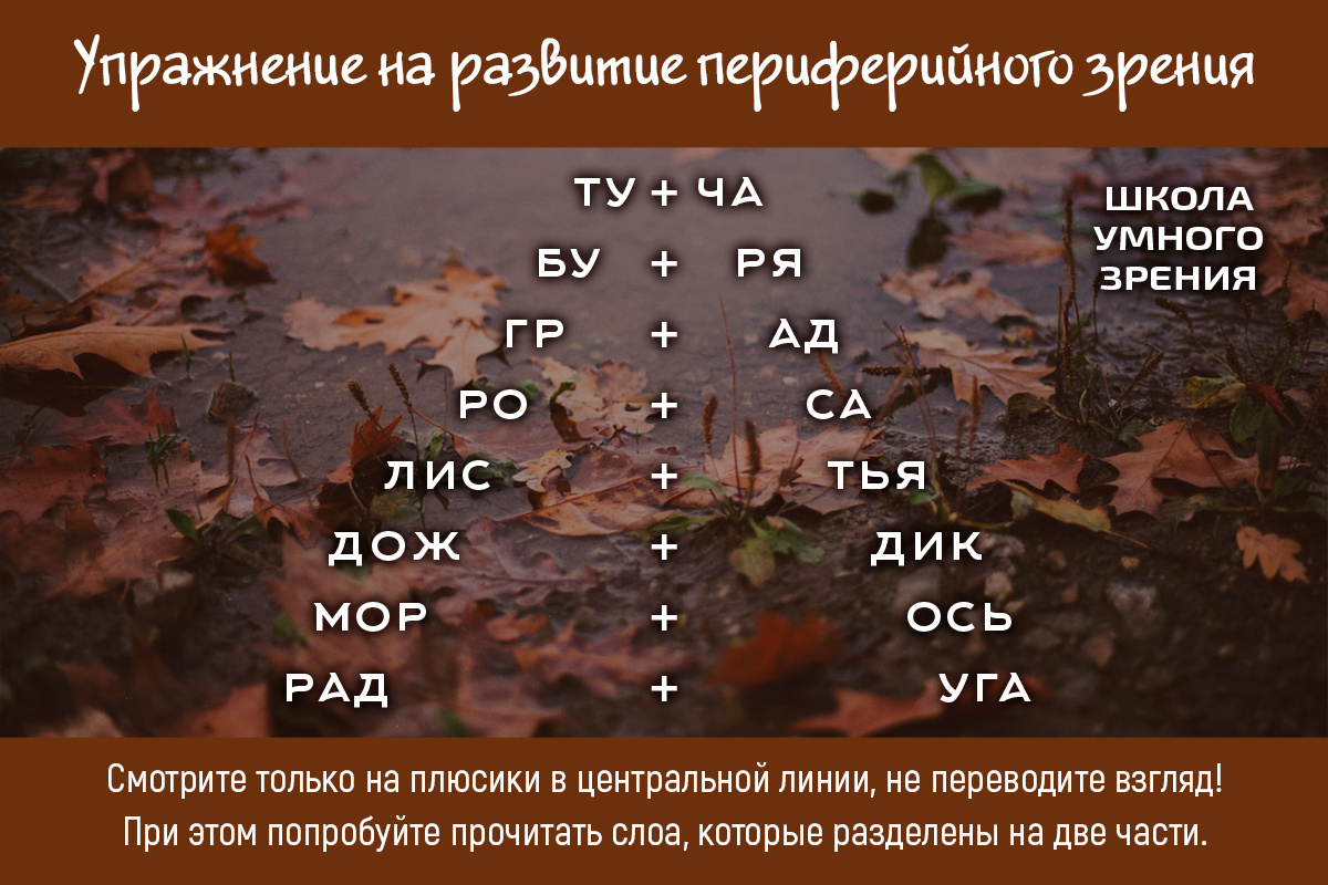 Снимает зрительное напряжение после работы за компьютером, улучшает работу мозга, увеличивает зрительный обзор. Подходит при всех болезнях глаз! Занимает очень мало времени и оказывает мгновенное воздействие, выполнять 7-10 раз в день Необходимо смотреть только на центральные значки на картинке, не переводя взгляд периферийным зрением, сверху вниз, старайтесь прочитать слова, которые разделены на две части. Не стесняйтесь оставлять комментарии! 💬