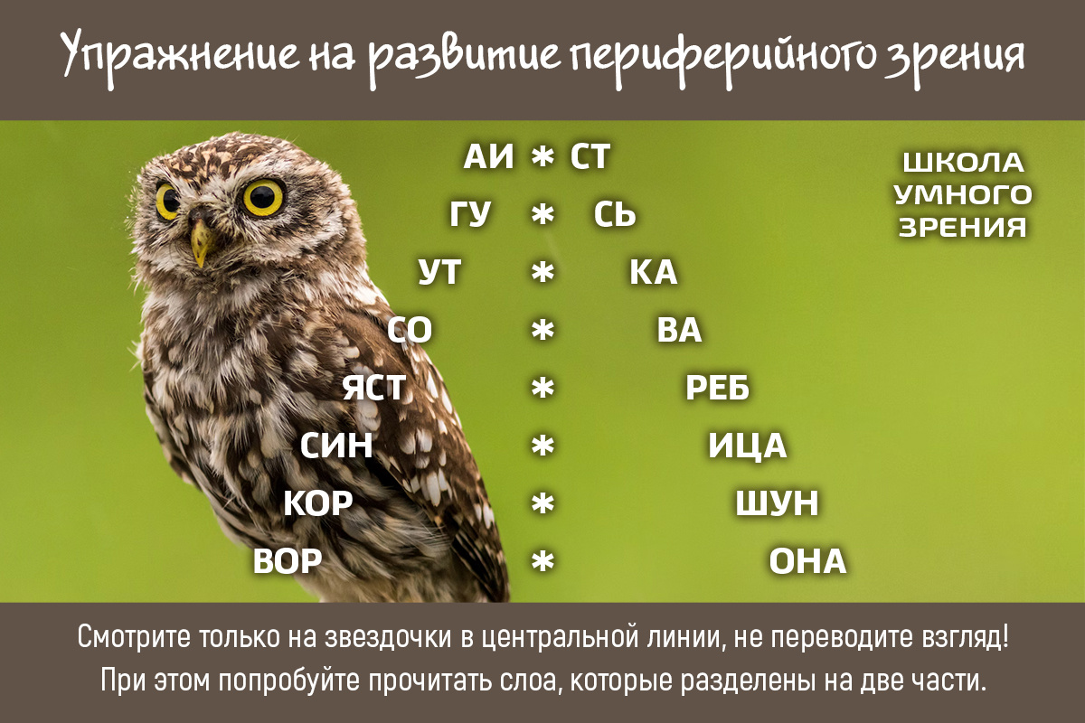 Снимает зрительное напряжение после работы за компьютером, улучшает работу мозга, увеличивает зрительный обзор. Подходит при всех болезнях глаз! Занимает очень мало времени и оказывает мгновенное воздействие, выполнять 7-10 раз в день Необходимо смотреть только на центральные значки на картинке, не переводя взгляд периферийным зрением, сверху вниз, старайтесь прочитать слова, которые разделены на две части. Не стесняйтесь оставлять комментарии! 💬