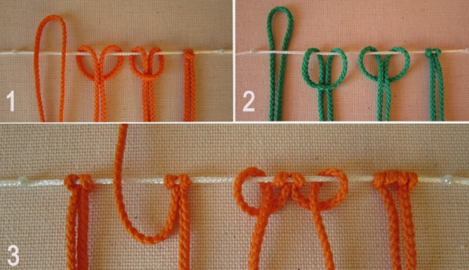 В начале работы нити нужно закрепить, или, как принято называть эту операцию, навесить. Основой для навешивания нитей может быть вспомогательная нить или любая жесткая основа, например, кольцо.