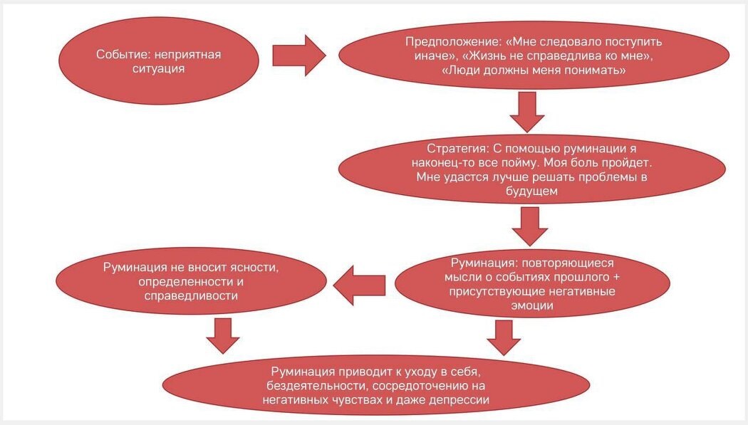 Руминации — это навязчивые размышления, переживания. Часто они бывают сосредоточенными на себе. То есть, люди думают о своей печали, они прокручивают в голове негативные мысли, вспоминают свою боль, страдания, которые были в прошлом.