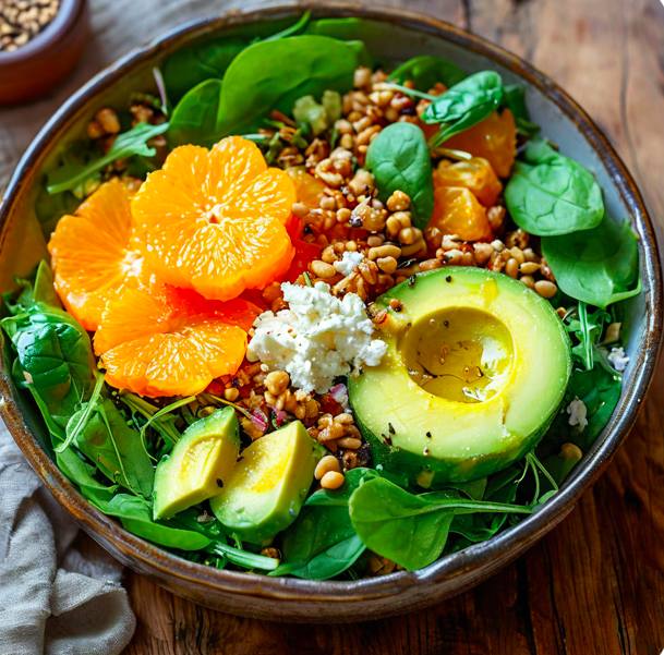 - 2 крупных мандарина - 1 авокадо - 100 г шпината (можно заменить на листья салата) - 50 г феты или сыра брынза - 1 небольшая красная луковица - 30 г кедровых орешков - 3 столовые ложки оливкового масла - 1 столовая ложка бальзамического уксуса - Соль и черный перец по вкусу - Очистите мандарины и разберите их на дольки. При необходимости удалите косточки. - Очистите авокадо, удалите косточку и нарежьте мякоть ломтиками. - Красный лук нарежьте тонкими полукольцами. - Обжарьте кедровые орешки на сухой сковороде до золотистого цвета. Это займет буквально 1-2 минуты, не забудьте постоянно помешивать, чтобы они обжаривались равномерно. - В небольшой миске смешайте оливковое масло и бальзамический уксус. Посолите и поперчите по вкусу. - В большой миске смешайте шпинат, ломтики авокадо, дольки мандарина и красный лук. - Покрошите в салат сыр фета или брынзу. - Посыпьте все обжаренными кедровыми орешками. - Перед подачей полейте салат заправкой и аккуратно перемешайте. Этот салат отличается с