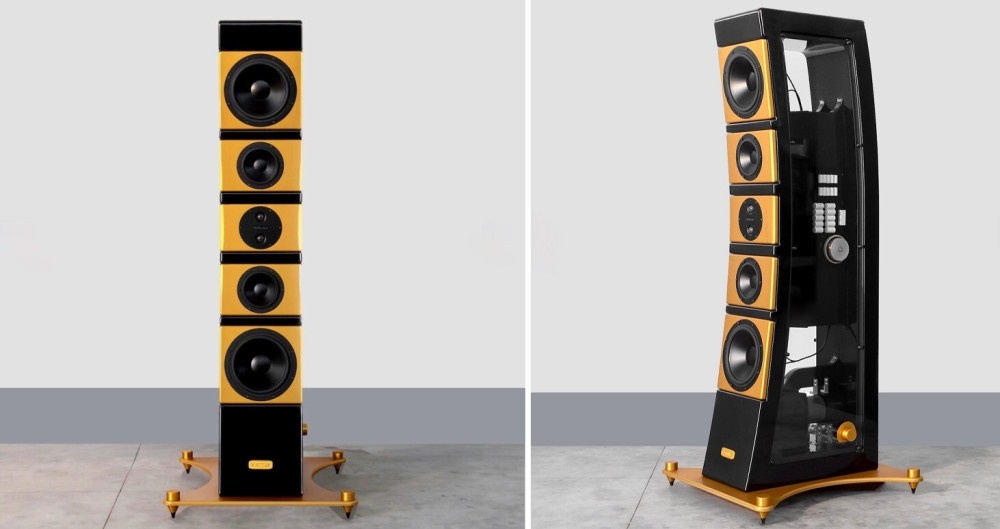 Секция баса в новом изделии состоит из двух низкочастотных динамиков диаметром 26 сантиметров, которые изготавливаются вручную компанией AudioTechnology. Уникальная магнитная система этих динамиков обеспечивает невероятно быструю переходную реакцию и высокую чувствительность. Точка пересечения между басами и средними частотами выбрана так, чтобы среднечастотные динамики функционировали с максимальной точностью и без искажений.
