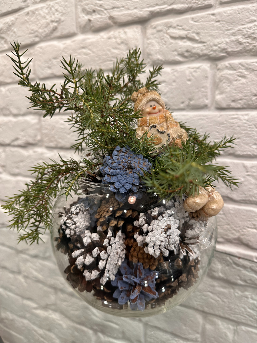 Во-первых, люблю декор из шишек. Благо этот материал валяется у нас под ногами на даче. Каждый год использую их по-разному: гирлянды во дворе, игрушки на елку, заполняю ими вазы и т.д. Крашеные шишки смотрятся лучше, и поверьте, это совсем не трудоемко. У меня остатки краски всегда идут в дело. Переложила в этот раз камни и ракушки из вазы, меняя летний декор на зимний.