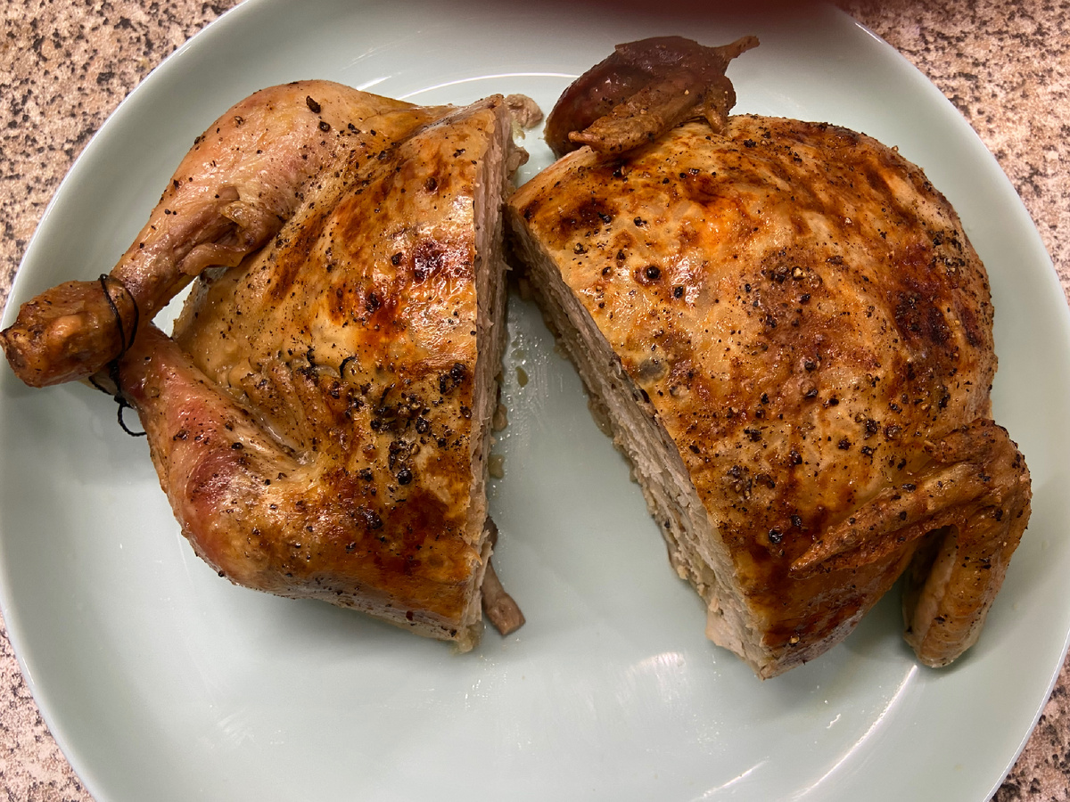 Ну что же…делюсь рецептом праздничного горячего😍 Самое потрясающее в этом блюде то, что вы можете выбрать абсолютно любую начинку. В конце поделюсь своими идеями. Ингредиенты: • целая курица (у меня 1,6 кг) • рис длиннозернистый 1/2 стакана • лук 1 средняя • грибы 300 гр Специи по вкусу: у меня соль, перец, сухой чеснок, столовая ложка соевого соуса и веточка размарина Курицу нужно помыть, затем аккуратно неспеша острым ножом начать оделять кожу. Это несложно, но потребуется внимательность, чтобы кожа осталась целой. Крылья и голени оставляем на коже. На фото видно, как я действовала. Можно поискать видео в интернете. В конечном итоге основной каркас полностью отделяется от тушки. Мясо нужно снять и мелко нарезать. Лук поджарить с грибами на смеси растительного и сливочного масел. Рис отварить до полуготовности. Смешать ингредиенты для начинки и сдобрить специями, соевым соусом. Дальше тушку начиняем аккуратно и плотно. Зашиваем. Обязательно нужно посолить т