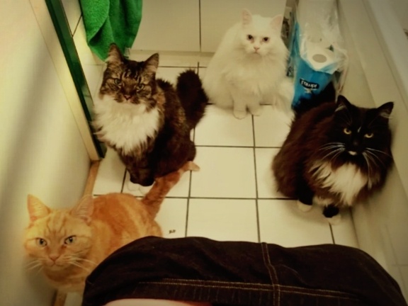 У нас каждый вечер происходит нечто подобное. Няша всегда сопровождает меня в душ. Если она проспала этот момент и не успела, то она начинает бесноваться за дверью и требовать ее впустить. Если я не слышу ее из-за шума воды, или мне лень вылезать из-под душа, то при выходе из ванной меня может ожидать небольшой бардак в коридоре: раскиданный наполнитель, вещи, погрызенный пакет или картонная упаковка.