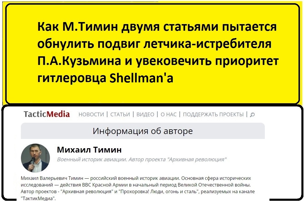 Что в сухом остатке? В двух своих статьях самопровозглашенный «военный историк авиации» М.Тимин популизирует боевой путь нацистского летчика, фактически обвиняет в трусости старшего лейтенанта Долгополова, делает вывод о недостоверности данных документов 127 ИАП, обнуляет подвиг Петра Кузьмина. Все для того, чтобы доказать, что первый сбитый в ВОВ за Вольфгангом Шелльманом?