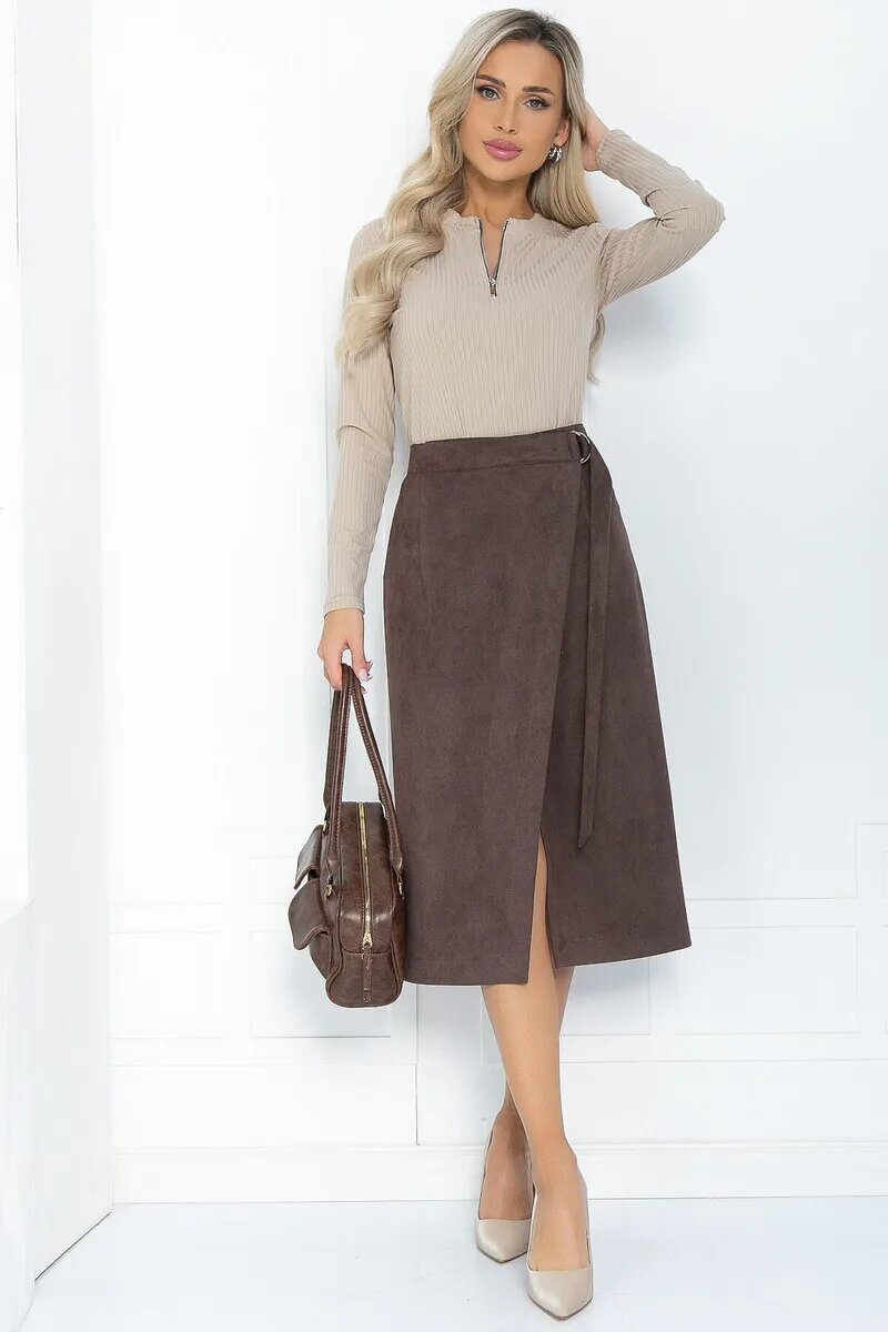 Чем старше женщина, тем благороднее на ней смотрятся глубокие насыщенные оттенки. Сочетание таких тонов с мягкими текстурами усиливает этот эффект. Женственность юбки с запахом повышается замшей и красивым кофейным оттенком. Эта юбка будет уместной в самых разных ситуациях.