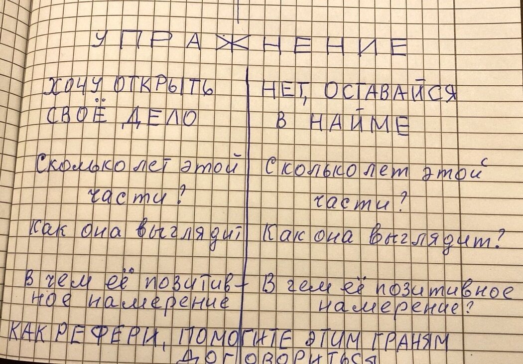 Кто внутри вас борется? Кто за, кто против? Дайте по очереди высказаться всем своим граням. В чем позитивные намерения каждой?