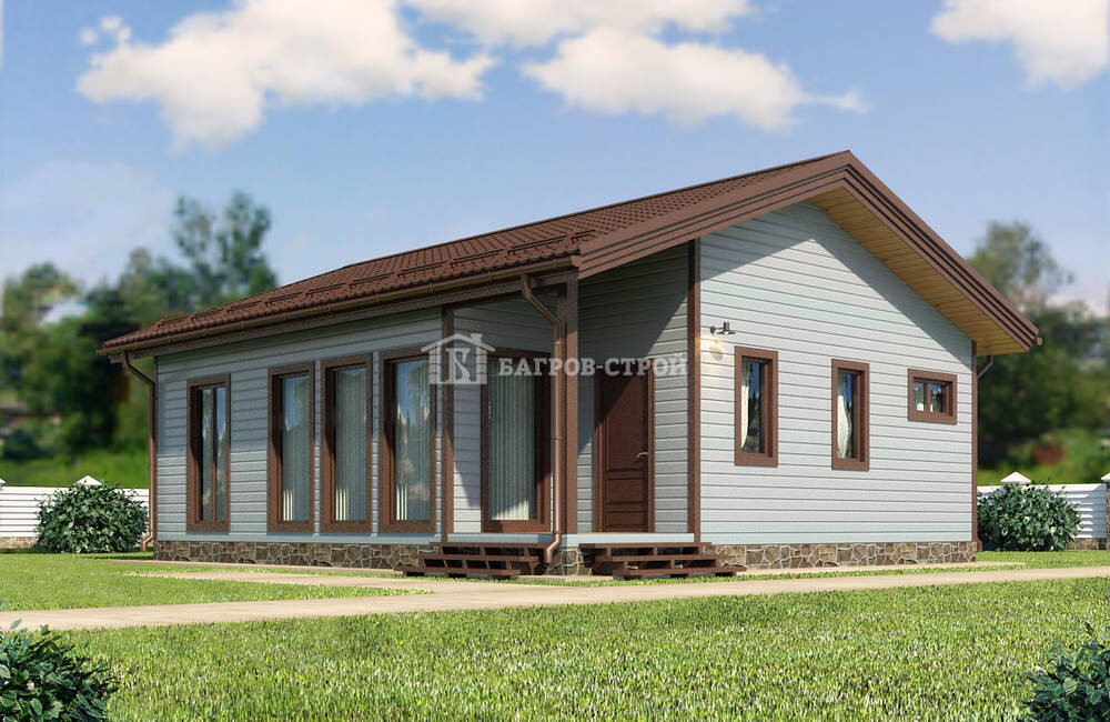 «Самсон» - каркасный одноэтажный дом 8х9м с крыльцом. Общая площадь дома 72 м². Планировкой предусмотрены просторная кухня-гостиная 27,02 м², 2 спальни по 10,97 м², сан.узел и сауна, а также тех.помещение и тамбур. • Площадь: 72 м2