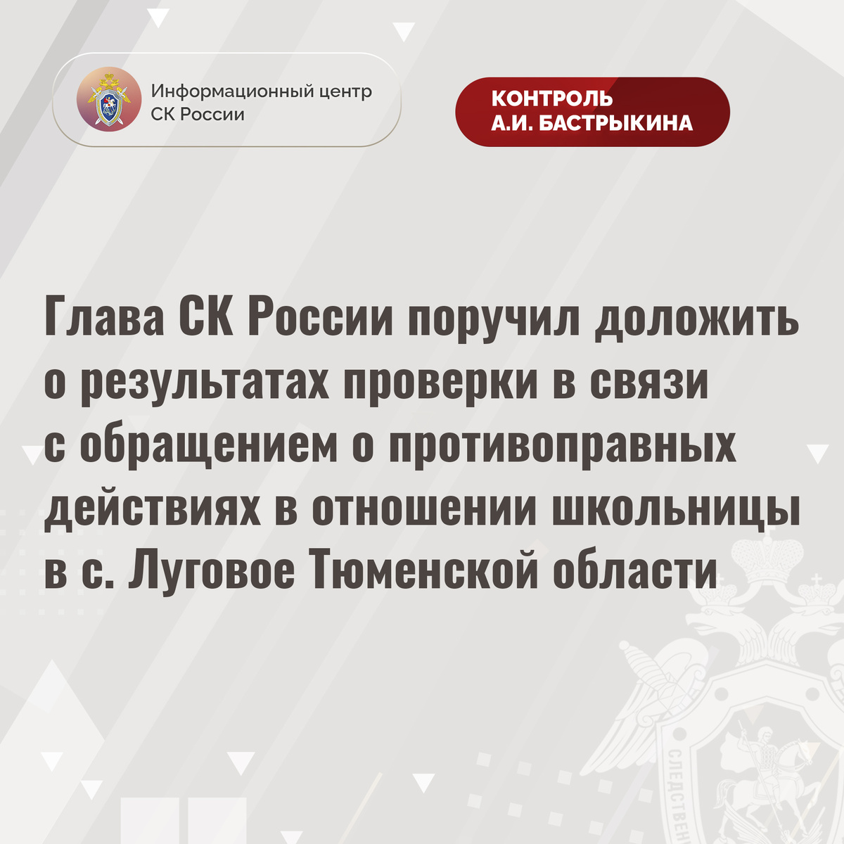 Глава СК России поручил доложить о результатах проверки в связи с обращением о противоправных действиях в отношении школьницы в с. Луговое