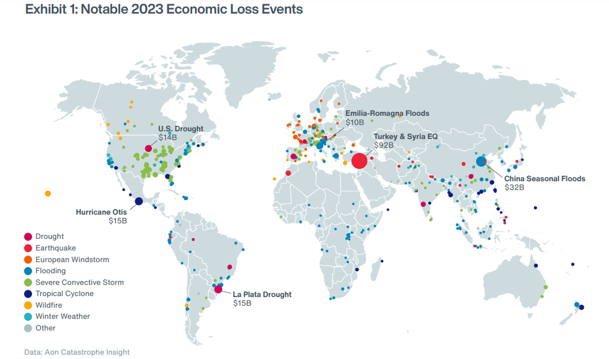Экономические потери от природных катастроф в мире в 2023 году оцениваются в 380 миллиардов долларов, что превышает как долгосрочные, так и краткосрочные средние показатели, после корректировки исторических потерь с учетом современных значений на основе Индекса потребительских цен США. В 2023 году на всех континентах были зафиксированы значительные природные катастрофы, а многие страны столкнулись с крупнейшими бедствиями в своей современной истории. Глобальная карта показывает характер событий и опасных явлений, которые внесли вклад в общие экономические потери в 2023 году. Основным фактором потерь стали землетрясения, хотя это было в значительной степени вызвано несколькими событиями, в частности серией землетрясений в Турции и Сирии. На втором месте оказались сильные конвективные бури, причем наибольшие отдельные потери были сконцентрированы в Соединенных Штатах и Европе. В то же время глобальная карта также показывает, что прямой экономический ущерб от катастроф сконцентрирован в р