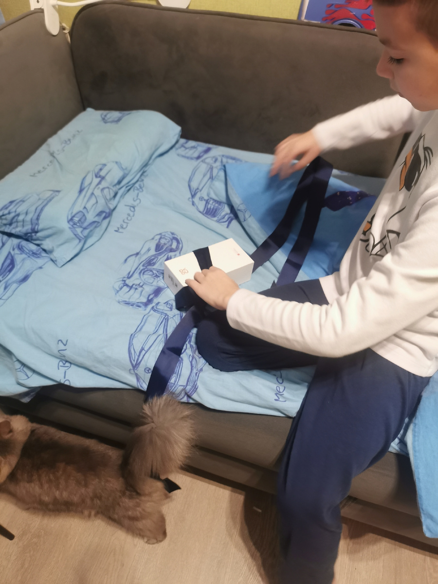 Сын очень ждал подарка, и, конечно, знал, что это будет телефон. Только не знал, какой именно. Мы заказали телефон заранее, повязали ленточкой и прямо с утра он получил свой подарок. Распаковывал прямо в пижаме.
