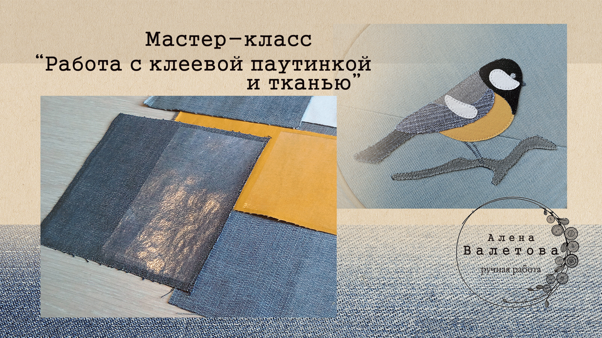 В работе над аппликацией я использую клеевую паутинку. Клеевая паутинка- это тонкий нетканый материал из клеевых волокон. Она выпускается в виде полотна и в виде ленты разной ширины, черная или белая. Плотность разная – 23 г/м2, 32 г/м2, 40 г/м2. Я использую 40 г/м2, она надёжно склеивает материалы – джинсовую ткань, фетр. При помощи клеевой паутинки фиксирую детали аппликации на фоне, что существенно упрощает работу. Кроме того, это предотвращает осыпание ткани по срезу в процессе работы и уменьшает в процессе эксплуатации. ! Все работы с клеевой паутинкой и утюгом лучше проводить только через ткань - проутюжильник. ! Понадобится подложка от самоклеющейся пленки или бумага для выпечки с силиконизированным покрытием. 1. Прогладить основной материал. Если ткань новая, то её нужно декатировать (провести влажно-тепловую обработку чтобы исключить дальнейшую усадку). Убедиться, что на материале (паутинке, ткани для деталей и фона) нет мелкого мусора. Отрезать клеевую паутинку нужного разме