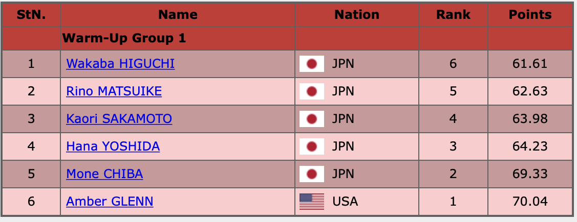 Женщины вчера удивили, и после такой короткой можно было спрогнозировать самые разные варианты пьедестала. Несмотря на ошибки, шансы не медали даже с таким разбросом баллов были у всех. Мы сегодня увидели два тройных акселя в исполнении двух разных спортсменок! Порядок выхода спортсменок на лёд и баллы первого дня: Двойной аксель - чисто. Тройной лутц с тройным тулупом - чисто. Тройной риттбергер - чисто. На этом стартовые прыжки завершились. В середине был только двойной сальхов вместо тройного - и это единственная серьёзная ошибка Вакабы в прокате. Во второй половине все прыжковые исполнены чисто, разве что флипу отметили неясное ребро. Дорожка 4 уровня, вращения 3 и 4 уровня. Программа красивая, смотрится, у хореографии есть развитие. К дорожке в конце есть ещё силы, в том числе эмоциональные. С большим удовольствием посмотрела её выступление. Результат ПП: 134.35 Сумма: 195.96 Тройной риттбергер - с ошибкой на приземлении и недокрутом. Тройной лутц с тройным тулупом и двойным тул