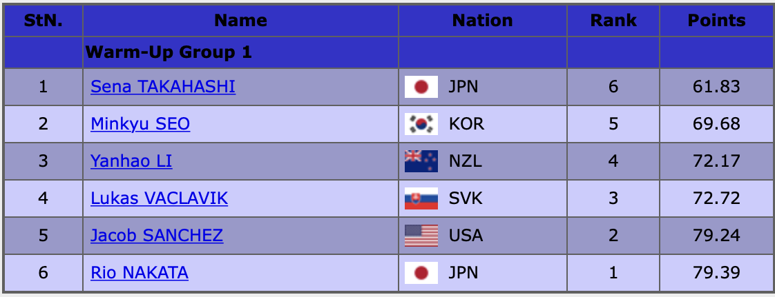 Баллы первого дня и порядок выхода на лёд: Тройной лутц с тройным тулупом - чисто. Тройной аксель с двойным тулупом - чисто. Тройной флип - чисто. Во второй части был чистый тройной аксель. Была ошибка на каскаде из тройного флип и двух двойных акселей - и это единственная помарка. А так прокат можно назвать чистым. Вращения 2, 3 и 4 уровня. Результат ПП: 142.57 Сумма: 204.40 Тройной аксель с тройным тулупом - чисто. Тройной аксель - чисто. Тройной риттбергер - чисто. И завершил стартовую серию тройным флипом с двойным тулупом. Во второй части все прыжки исполнены без ошибок, только на сольном лутце стоит неверное ребро. Вращения 4 уровня. Катался под музыку из фильма "Поющие под дождём". Для меня было мало хореографии, хотелось бы больше танца и каких-то соответствующих теме движений. Но скользит парень хорошо. Результат ПП: 152.46 Сумма: 222.14 Тройной аксель с двойным тулупом - недокрут на акселе. С сольного тройного акселя упал, был недокрут в четверть. Тройной риттбергер - чисто.