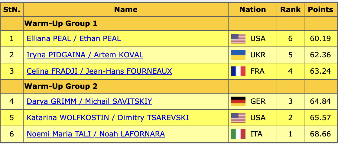 Список участников и баллы первого дня: Твизлы на 4 уровень - но смотрелись тяжело. Вращение неплохое. Характерная дорожка шагов неинтересная, но исполнена чисто. Одна из поддержек не получилась. Честно скажу, что не помню их прокат в РТ, но сегодня по льду они едва скользили. Выглядели очень медленно. А вот синхронность в движениях неплохая. Результат ПТ: 82.89 Сумма: 143.08 Дорожка на одной ноге - 2 и 3 уровня. Первая поддержка чистая. Хорео спираль красивая. Вторая поддержка тоже получилась. Дорожка по диагонали на 1 и 2 уровни. Твизлы на 4 уровень у обоих. В конце вращение на 2 уровень. Произвольный танец мне понравился у них больше, чем ритмический. Сегодня смотрелись увереннее. Результат ПТ: 89.91 Сумма: 152.27 Поддержка в начале уверенная - на 4 уровень. Первая дорожка на 2 и 3 уровни. Твизлы на 2 и 4 - партнёршу очень заметно повело. Дорожка на одной ноге на 2 и 1 уровни. Программа была, скорость держали, исполнение довольно выразительное, но есть куда расти. Результат ПТ: 88.4