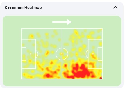 Это тепловая карта, или карта касаний. Ее суть в следующем: чем больше касаний совершил игрок на конкретной точке поля, тем красней она будет отмечаться на карте. Виден стиль игры Мбемо – преимущественно на фланге, с возвращениями в оборону.