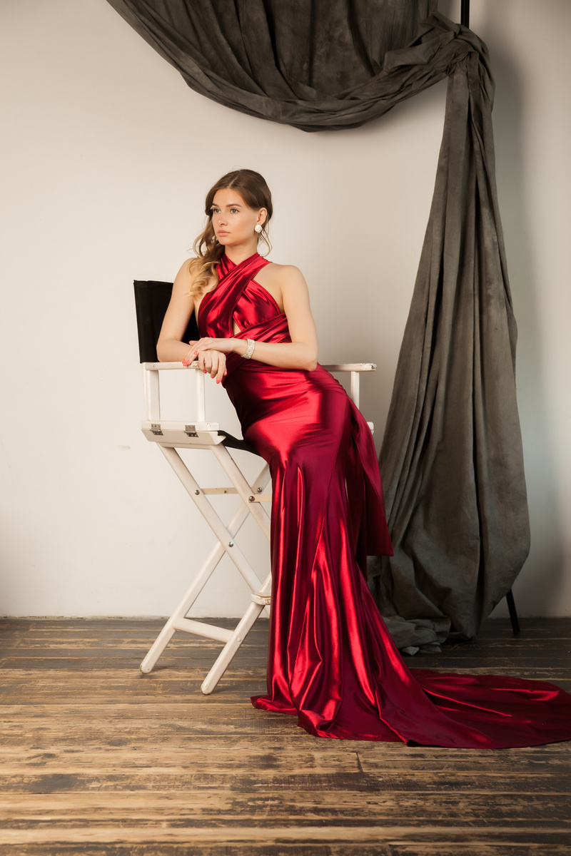 Эта фотосессия стала своеобразным путешествием в мир гламура и элегантности, где современные технологии переплетаются с духом фотоателье начала прошлого века. Идея заключалась в том, чтобы создать атмосферу, напоминающую старинные студии с их изысканными тканями и драпировками. При этом важно было не только подчеркнуть красоту модели, но и добавить в кадр нотку художественной игры. В центре съемки оказалось роскошное атласное красное платье, идеально отражающее шик и магию голливудского стиля. Блеск ткани в лучах света напоминал переливы красного вина, а каждая складка словно оживала, подчеркивая грациозность линий и силуэта. Работа с платьем потребовала особого внимания. Атласная ткань невероятно эффектно смотрится в кадре, но при этом каждая складка должна быть идеальной. Нужно было постоянно следить за тем, чтобы складки платья не были небрежными, а их линии подчеркивали элегантность и гармонию образа. Каждое движение модели сопровождалось тщательной корректировкой ткани, чтобы доби