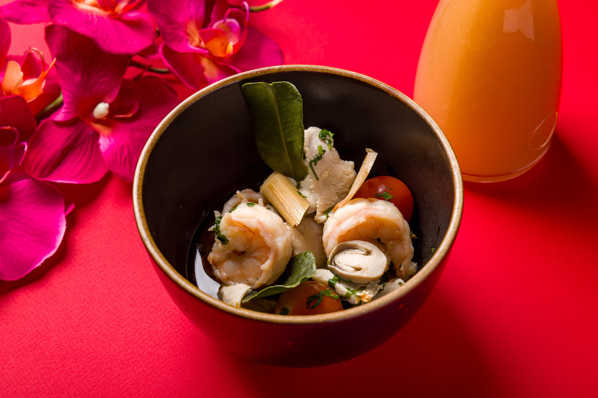 Рецепт шеф-повара Black Thai Артема Мартиросова Ингредиенты для приготовления базы (1 литр): Способ приготовления: Все овощи и травы нарезать в произвольном порядке и обжарить до яркой карамельной корочки. После добавить рыбный соус и тамаринд пасту и обжаривать еще 3-5 минут на среднем огне. Добавить бульон и томить на слабом огне в течение 30-40 минут. Ингредиенты для подачи и сервировки: В сотейник ввести 150 гр. базы, добавить тонко нарезанную куриную грудку, добавить нарезанные грибы цаогу, томаты черри, заранее отварные мини баклажаны, рубленный перец чили, а также очищенные тигровые креветки. Довести до кипения после чего добавить кокосовое молоко и довести до вкуса специями. Шеф рекомендует подавать том-ям, украшая центр листьями кинзы. Приятного аппетита!
