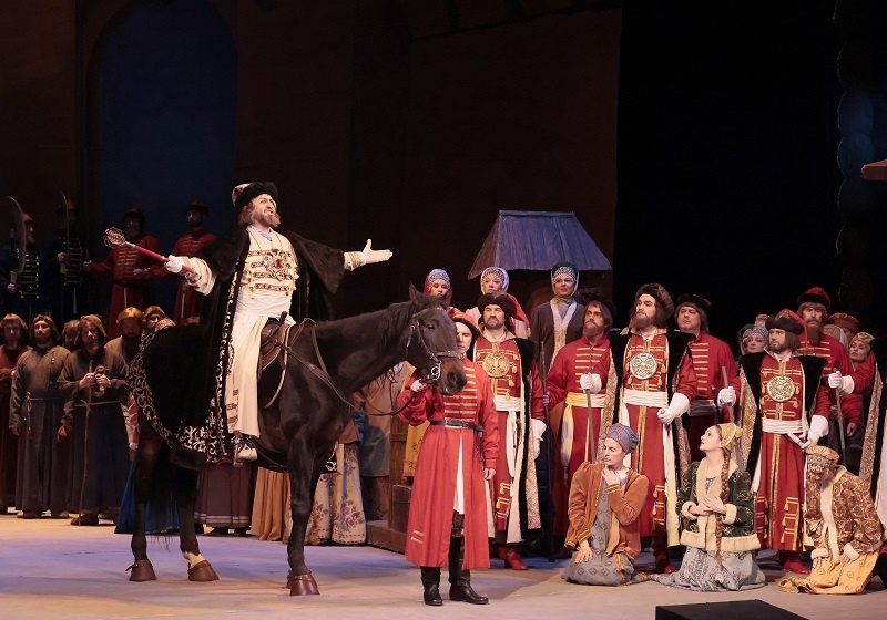 Вне зависимости от того, чем полагать эту «Хованщину» — старым мариинским спектаклем, габтовской премьерой или копродукцией обоих театров — суть ее от этого не меняется: масштабный историко-реалистический спектакль с одной стороны производит неизгладимое впечатление, особенно, если его смотришь впервые — своей монументальностью, размахом, проработанностью роскошных деталей, красотой гармонии всех компонентов; с другой он все больше и больше напоминает ритуал, некое религиозное действо по канону, или застывшие формы искусства по типу театра кабуки или пекинской оперы. Получается, проходят десятилетия, а в оперном искусстве России ничего не меняется, никакого развития нет — и лучше (или хотя бы по-другому), чем Баратов сделать законченные вершинные оперы Мусоргского у нас невозможно: всегда оптимальный вариант — это «как при бабушке» (точнее уж, при «дедушке» — то бишь при Иосифе Виссарионовиче).