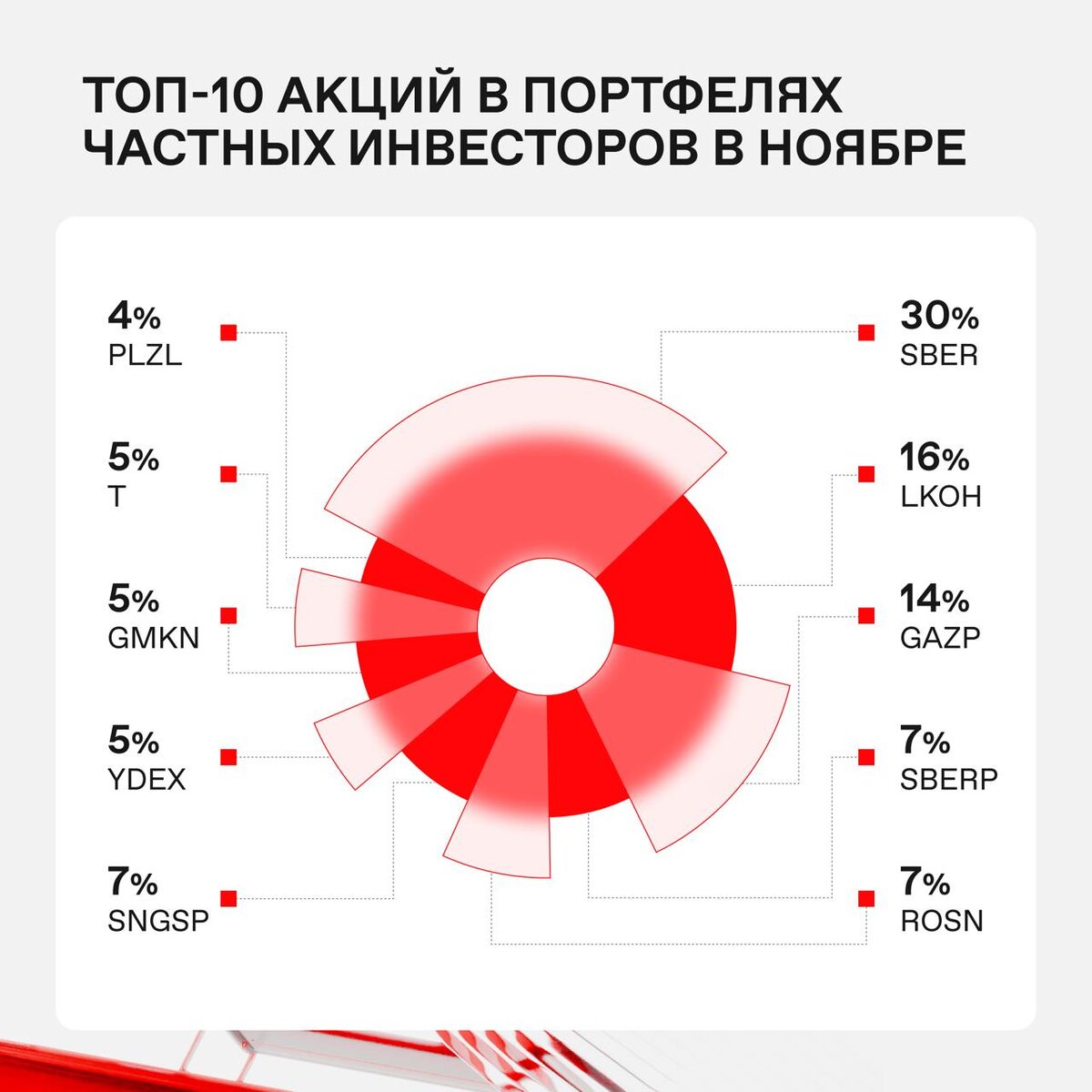 Как выглядит портфель акций РФ у среднего инвестора («народный портфель») на Мосбирже по итогам ноября: 1. Сбербанк ао - 30% 2. Лукойл - 16% 3. Газпром -14% 4. Сбербанк ап - 7% 5. Роснефть - 6% 6. Сургутнефтегаз ап - 6% 7. Яндекс - 5% 8. Норникель - 5% 9. ТКС Холдинг - 4% 10. Полюс - 4% Выросла доля Сургутнефтегаз-п с 6% до 7% из-за роста котировок. За счет этого он переместился на 6 строчку. Доля Яндекса упала до 5%, т.к. цена акции снизилась. Выросла доля Норникеля с 4% до 5%. Это одна из сильнейших акций ноября. Доля Т-Технологий (ex. ТКС Холдинг - Тинькофф) выросла с 4% до 5%. По секторам: Нефтегаз - 44% Банки - 42% IT - 5% Цв. металлургия - 5% Золото - 4%