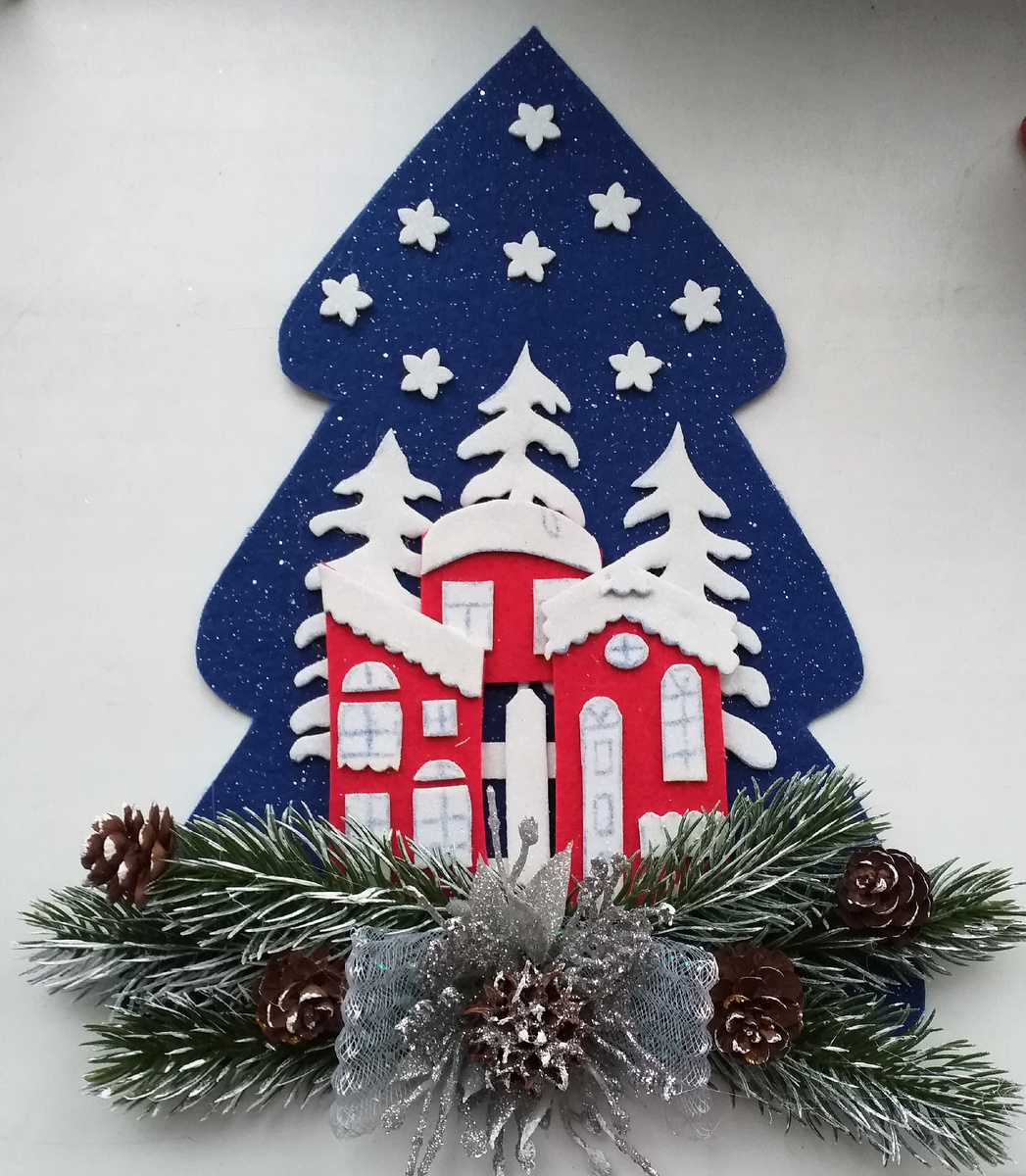 1.Вырезала ёлочку из мягкого фетра. 2. Для жёсткости приклеила на картон клеем ПВА и оставила минут на 30 под прессом. 3. Тем временем вырезала ёлочки из белого глиттерного фоамирана и фигурным дыроколом звёзды. 4. Далее вырезала детали домиков. Домики вырезала из жёсткого красного фетра и остатков белого фоамирана. 5. Сделала из того же глиттерного фоамирана заборчик и склеила его при помощи клеевого пистолета. 6. Затем все готовые детали приклеила на ёлочку клеевым пистолетом, оставив внизу 2 см для декора. 7. В качестве декора использовала пластиковые еловые лапки, шишки лиственницы и ещё какого - то южного дерева, немного органзы и новогодних веточек и готово. 8. Последний штрих - по веточкам и шишкам прошлась сухой кистью с небольшим количеством акриловой краски. Всем творческих успехов.