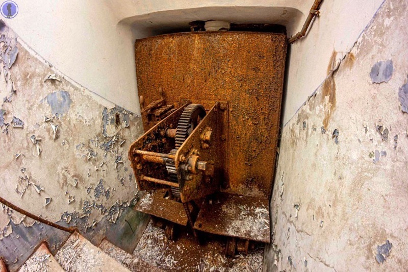 А так выглядит обратная сторона первого защитного затвора, двигавшегося по потерне. Здесь хорошо виден редуктор, приводивший затвор в движение.