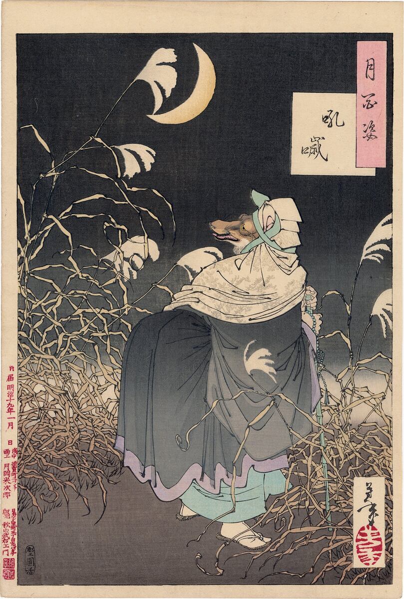 Укиё-э «Крик Лисы», автор Цукиока Ёситоси (1839 - 1892) из серии «100 видов луны» 1886 г. Изображение Лисы-оборотня на гравюре иллюстрирует сюжет Кёгэн театра Но. Кёгэн - один из видов традиционного театра Японии. Представляет собой народный комедийный драматический жанр, развившийся из комических элементов представлений саругаку и сложившийся к XIV веку. Первоначально кёгэн существовал как самостоятельный жанр, однако со временем его представления вошли в качестве интермедий в представления театра Но (Википедия). Этот сюжет основан на легенде о монахе Хакудзосу, который почитал божество Инари и держал в храме несколько лис, с помощью которых предсказывал будущее. В театральной постановке Лиса-оборотень является племяннику в образе Хакудзосу и просит охотника прекратить промышлять лис, потому что это грех. Лиса почти убедила его, но, после того как ушла попала в силки, расставленные охотником, и подняла лисий крик. На гравюре виден процесс превращения лисы из монаха в свой первоначальн