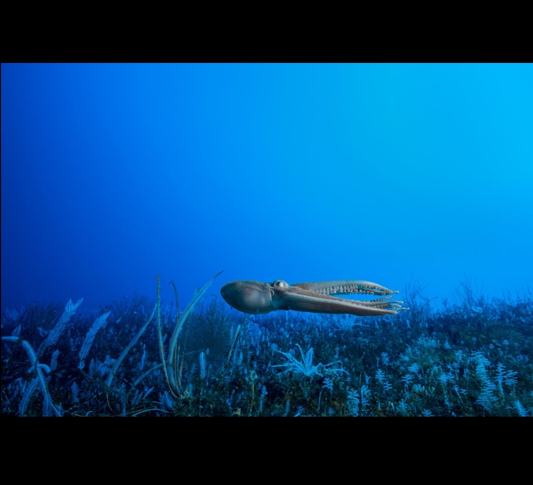 1) Осьминог плывет над морским дном, полным жизни.