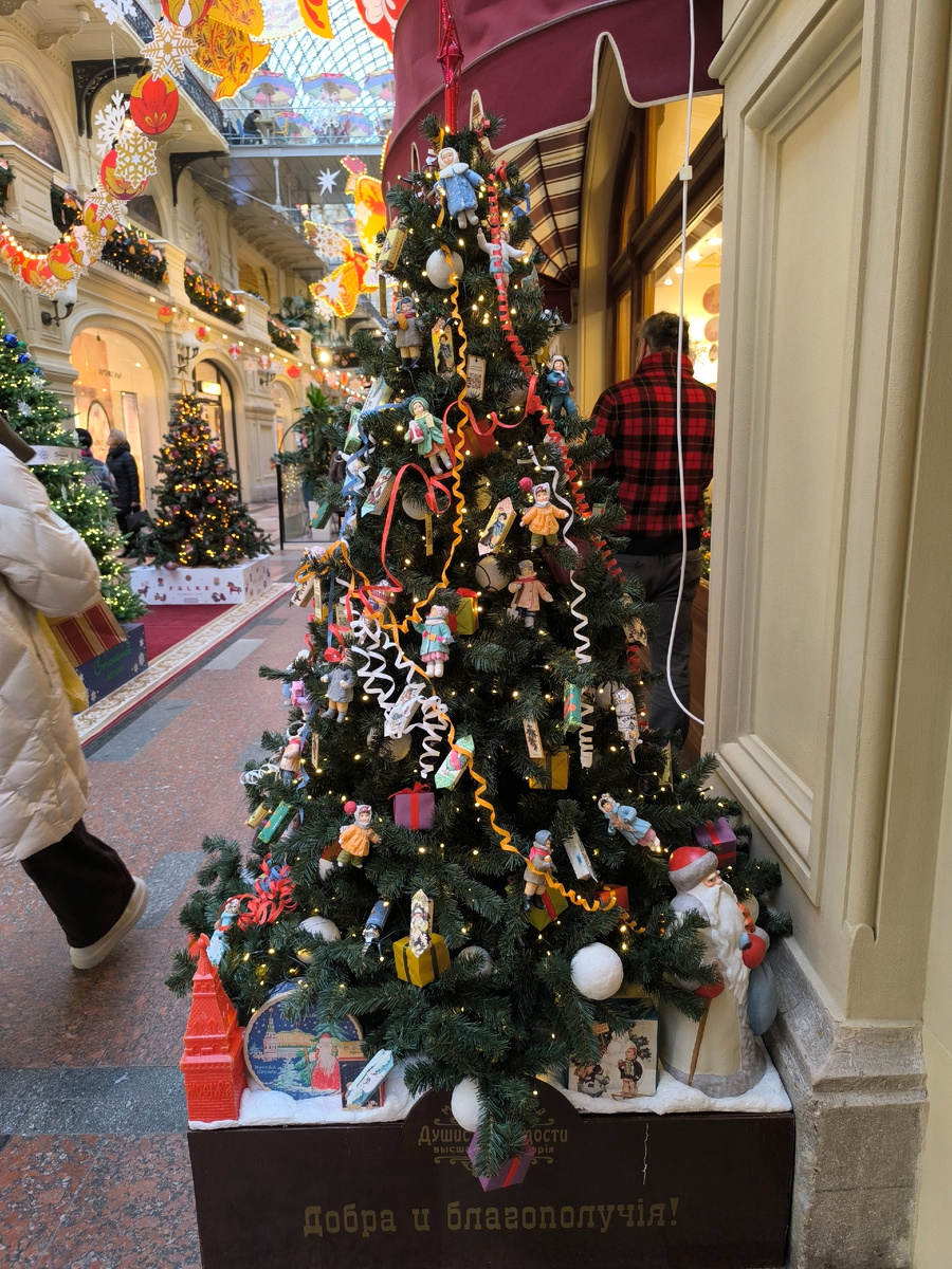 Продолжаем прогуливаться по линиям Главного Универсального Магазина и восхищаться прекрасными дизайнами новогодних ёлочек от различных магазинов, брендов, благотворительных фондов, театров, телеканалов, печатных изданий, киностудий, производителей... И начинаем вторую серию просмотра с ёлочки от магазина и фабрики "Душистыя радости" из славного города Коломны. Магазин "Душистыя радости" -- украшение Гастронома №1. Ёлка очень красивая. Одна из моих фаворитов этого года. В связи с этим, дорогие читатели, предлагаю вам выбрать наиболее понравившиеся вам ёлки этого выпуска. А когда просмотрим все ёлки, определим самые красивые ёлки на выставке 2024. Ёлка украшена коллекционными ёлочными игрушками из ваты. В Коломне находится производство и магазин. Также эти коллекционные игрушки продаются на новогоднем базаре у главной ёлки ГУМа. Сфотографировала некоторые из них. Это высокохудожественные работы -- фигурки детей в стиле 50-х-60-х годов 20 века. Каждая игрушка детально проработана, каждая