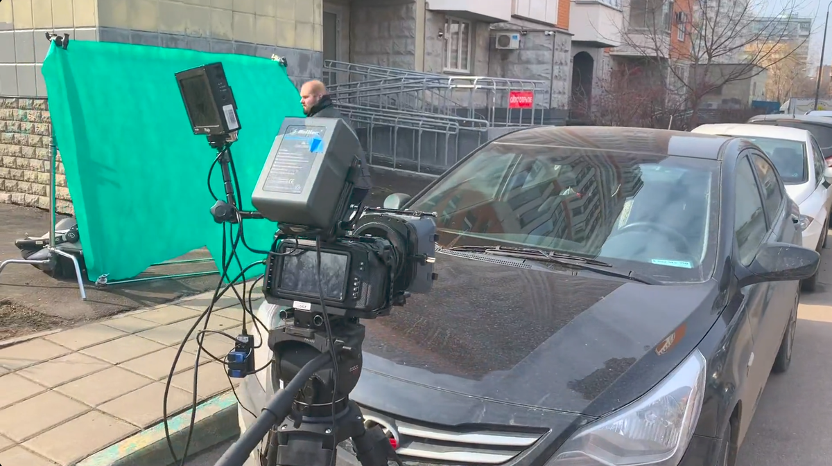 Так как мы до этого не снимали никогда автомобили, нам пришлось провести подготовительную тестовую съемку. Вот здесь мы во дворе снимаем машину на разные объективы с разными фильтрами и разным fps. Чтобы в дальнейшем понять, как именно снимать машину. В итоге мы пришли к единому мнению, что лучше всего будет снять фоны на улице отдельно, а потом снимать машину в хромакейной студии. Мы крепили камеру на машину спереди и сзади и снимали проезд по одной и той же улице в шести направлениях: вперед прямо, назад прямо, влево вверх, вправо вверх, влево прямо, вправо прямо. После того, как мы провели съемку, мы обработали весь материал, посмотрели его и поняли, как уже дальше будем снимать в студии и что нам для этого нужно. Снимали в студии на ул. Подъемная. Заехали туда машиной и поставили ее у одной из стен. Дальше вокруг нее строили всю "декорацию" из света. Вот так выглядела "укомплектованная" машина для съемки. Над лобовым стеклом располагается черное полотно — оно удаляет почти все отра