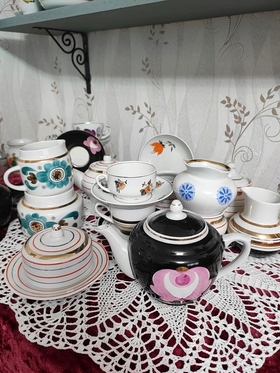 Всем доброго времени суток !!! Сегодня суббота, встала поздно, нажарила блинчиков на завтрак, приготовила обед и занялась уборкой. Убралась в доме, перебрала два кухонных шкафа, провела ревизию в маленькой морозилке и помыла полы. Очень расстроилась, что задерживается доставка чайной пары с Авито, хотела сегодня похвастаться) Поэтому, решила провести уборку на полочках с моими фарфоровыми сокровищами, а когда убиралась, пришла идея сделать там перестановку. И теперь у меня так, на нижней полке почти без изменений, плясуны с чайными парами. Правда, сервиз "Жёлтый тюльпан" переехал на вторую полку, а на его место поставила чайные пары и часть сервиза Барановка. Ну и дальше, "Голубые хризантемы" тоже спустила чуть ниже, где стоял сервиз"Золотой дождь" и сервиз Бишкильского ФЗ, а их поставила на самую верхнюю полку. Как-то терялись мои полосатики на самом верху. Поэтому пока так, но думаю, что и это не последний вариант расстановки. На комоде статуэтки так и оставила. А ещё я пришла к вы